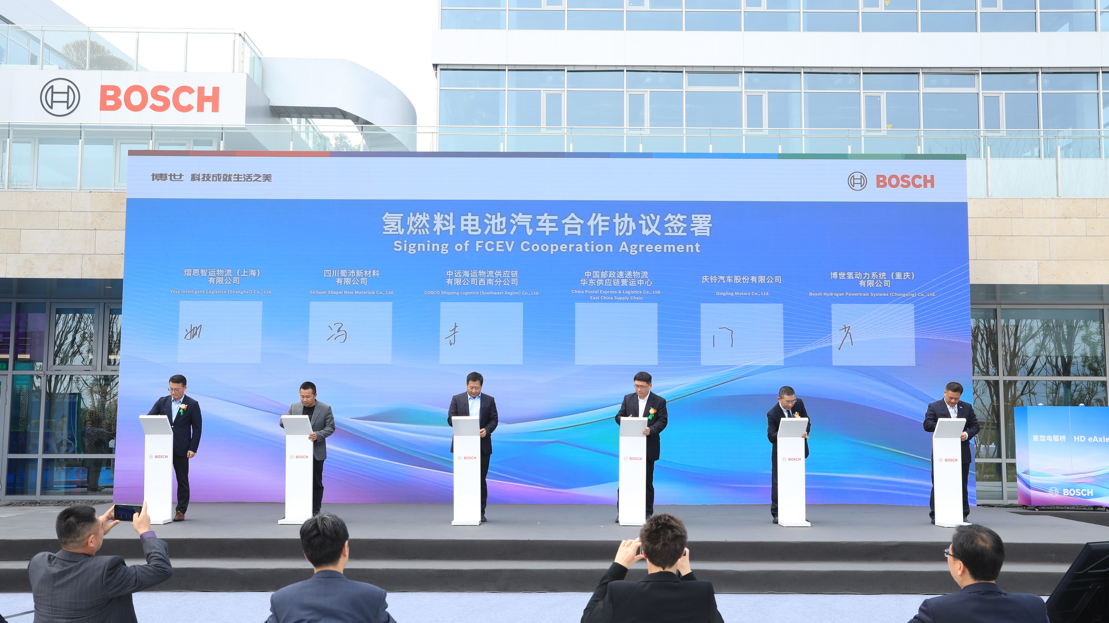 11月2日,博世氢动力产品发布暨签约交付仪式在博世氢动力系统(重庆)有限公司举行,华东营运中心总经理黄海腾代表金年会物流出席。仪式上,金年会物流与博世签署《氢燃料电池汽车合作协议,达成氢能物流战略合作。